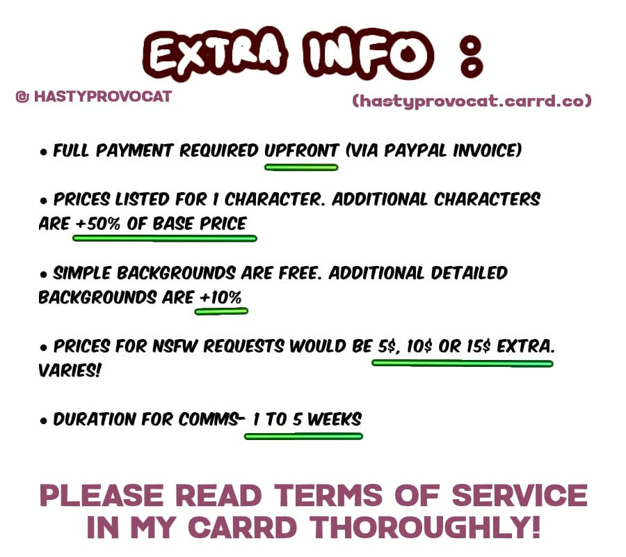 1. Payments must be made IN FULL via PayPal invoice in USD (plus a $5 or more transfer fee depending on the price of the comm). The invoice will include the full price breakdown2. Prices can change based on complexity. Please review the commissions info page for more details on pricing. Contact me if you need any further clarification!
